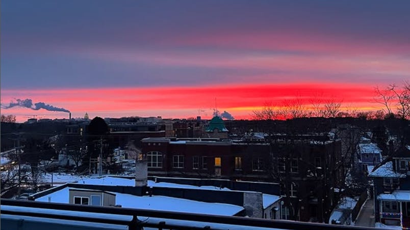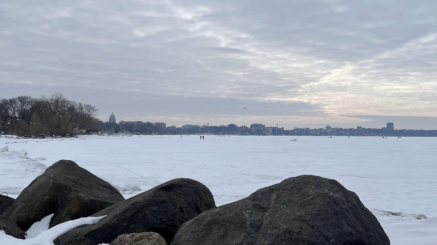 After all of that, I was exhausted. And it took me until around noon today to feel fully recovered from those hectic past two days. So naturally, I ate some lunch, then headed out for my long run. It felt good to be out there pounding the pavement again and part of my run took me by the lake and around Tenney Park where I could see people out on the ice enjoying this beautiful day.